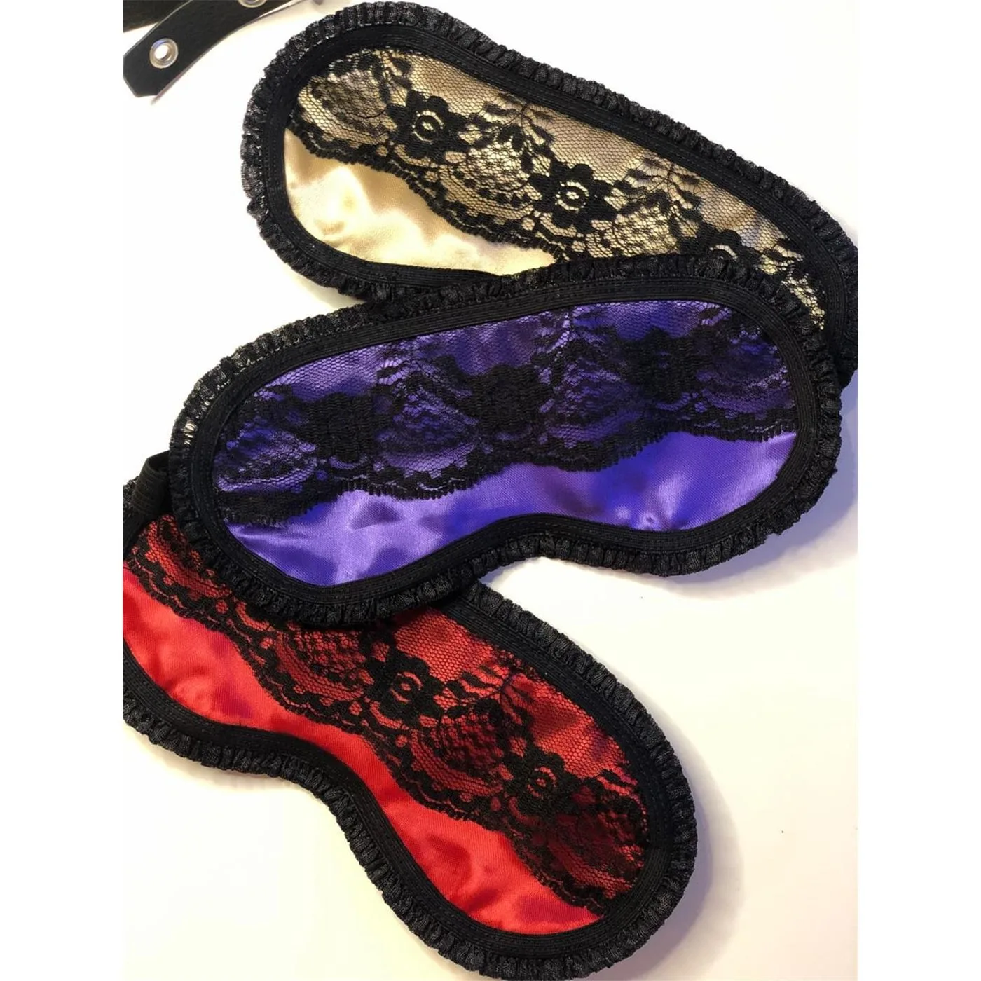 Antifaz realizado en confección de raso y detalle de puntilla en el contorno.