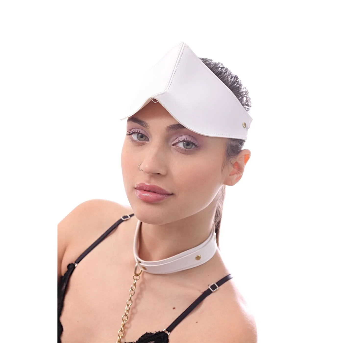 Infarta Fetish Antifaz Luxury Ciego Reforzado Blanco, parece ser un antifaz diseñado para experiencias sensoriales dentro del ámbito del fetichismo o el juego erótico.