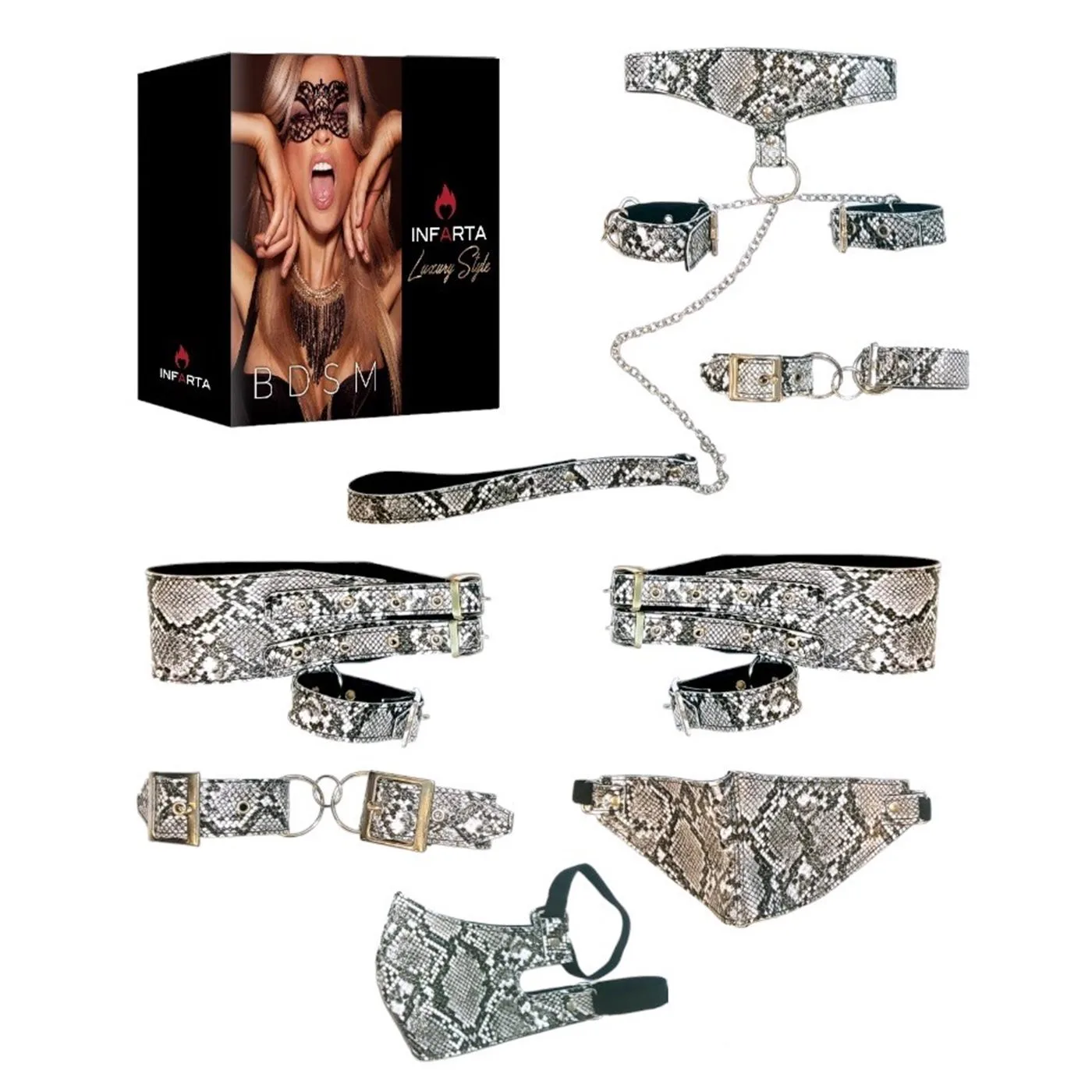 El KIT LUXURY REPTIL de la marca Infarta Fetish está compuesto por accesorios de cuero sintético con textura reptil, diseñados para juegos de dominación y placer. Incluye principalmente látigos y complementos de estilo fetichista, con un enfoque en lujo y estética sofisticada.