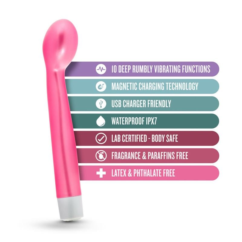 - Apunta la curva hacia tu ombligo para un placer profundo y retumbante en el punto G. Explore las 10 funciones de vibración.